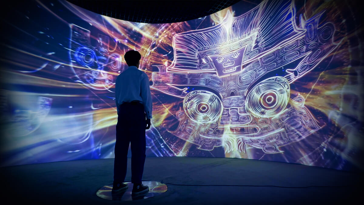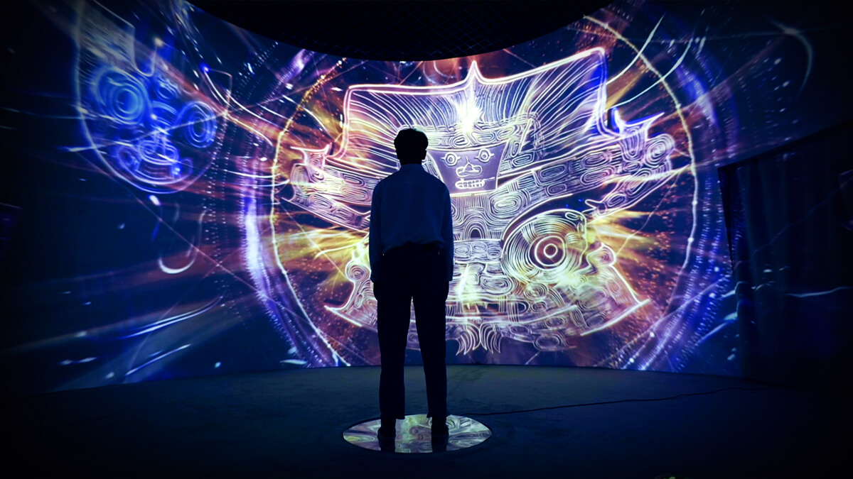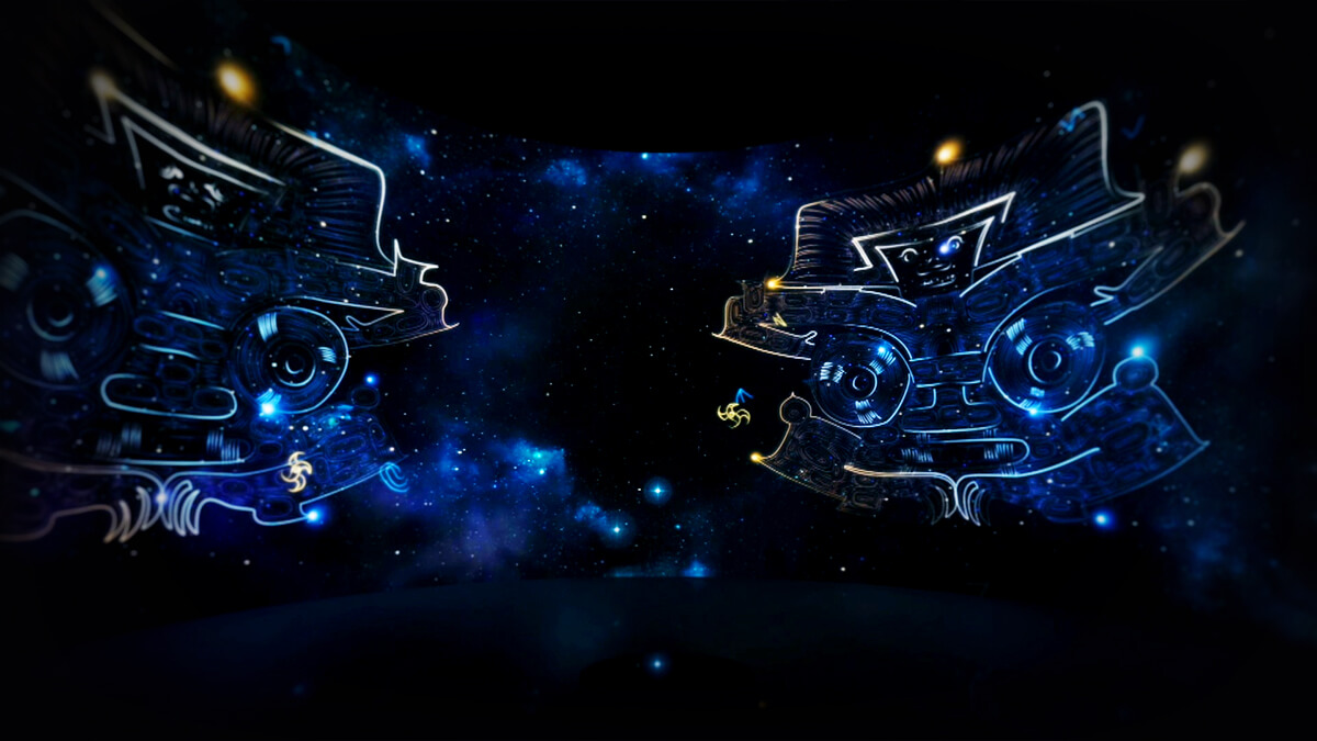 展廳以?xún)?nèi)圓外方的結(jié)構(gòu)象征良渚玉琮本身,當(dāng)觀眾走進(jìn)空間內(nèi)部,即如同進(jìn)入玉琮之中,可以看到四周弧形畫(huà)壁呈現(xiàn)的良渚生活動(dòng)態(tài)影像,從日間制玉、耕作等良渚生活場(chǎng)景,到夜晚滿天星河中閃現(xiàn)的神獸像與神徽符號(hào) 。