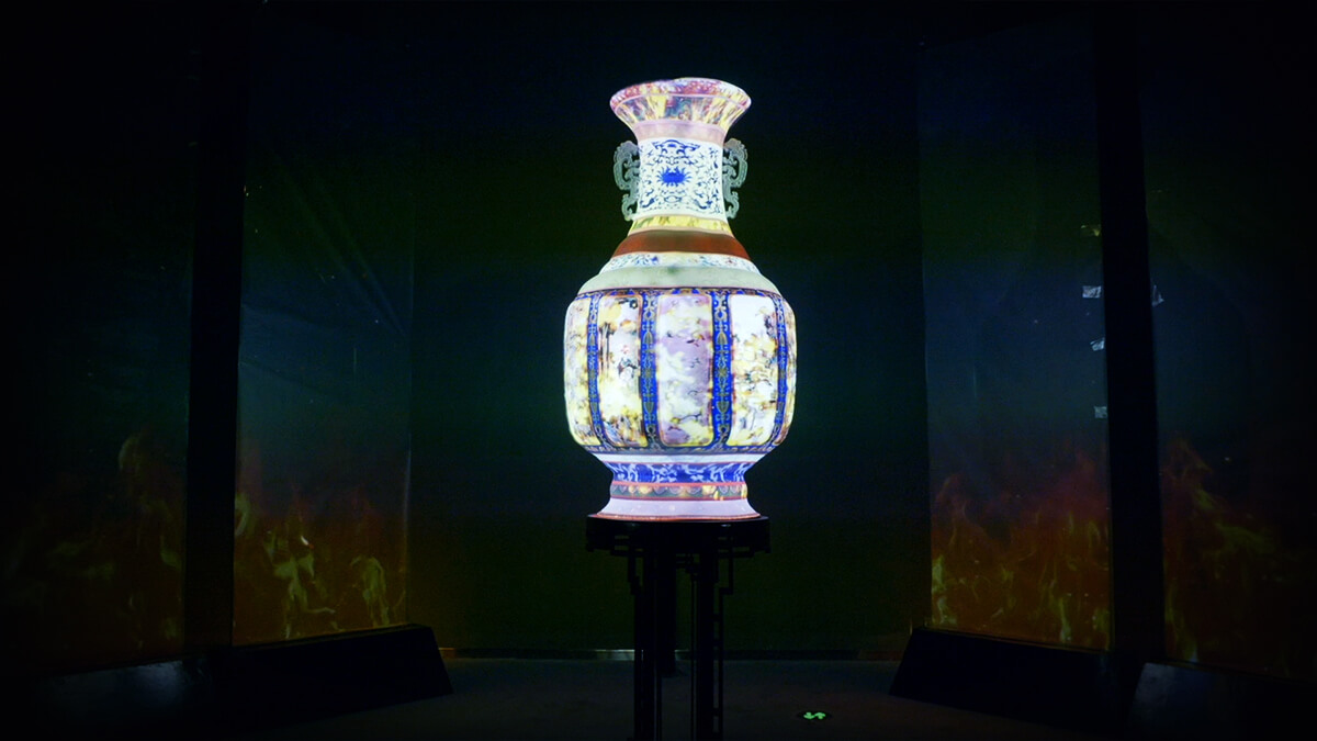 在該展項(xiàng)中,觀眾可通過(guò)交互桌的互動(dòng)游戲體驗(yàn)繁復(fù)有趣的上釉工藝,而釉彩變化和燒制過(guò)程,隨即呈現(xiàn)于瓶身和窗格內(nèi),賦予了國(guó)寶本身流動(dòng)的生命感,讓觀眾在寓教于樂(lè)的互動(dòng)體驗(yàn)中,獲得國(guó)寶之美的視覺(jué)震撼。