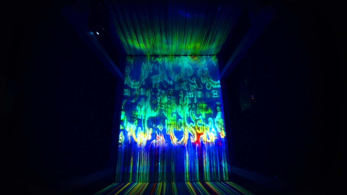 當(dāng)被用戶交互觸發(fā)后,浮雕影像點(diǎn)亮,呈現(xiàn)一種由黑場(chǎng)到開(kāi)幕的劇場(chǎng)感,并且營(yíng)造出將遠(yuǎn)古歷史”拉近"至眼前的感官體驗(yàn)。當(dāng)觀眾進(jìn)入到中央某一樂(lè)器感應(yīng)區(qū)中,即會(huì)觸發(fā)該樂(lè)器相應(yīng)音色的音軌,當(dāng)多個(gè)樂(lè)器被觸發(fā),即合奏出樂(lè)曲。
