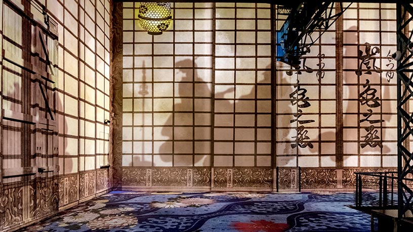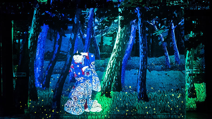 櫻花的短暫美麗讓位給由“妖怪”日本民間傳說,然后海的靈魂居住的神奇和神秘的森林,北齋的標志性的大波浪淹沒伴著音樂的空間克勞德德彪西 迷人的藝妓的特點,穿著和服,優(yōu)雅和豐富多彩的圖案,在米紙屏幕后面顯示。