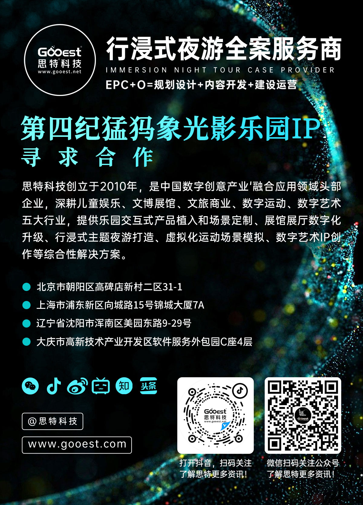 思特科技創(chuàng)立于2010年,是中國數(shù)字創(chuàng)意產(chǎn)業(yè)'融合應用領域頭部企業(yè)。依托強大的藝術(shù)創(chuàng)意、空間敘事、交互技術(shù)研發(fā)和內(nèi)容生產(chǎn)制作能力, 融合人機交互、成像顯示、CG動畫、云計算、AIGC、IOT等核心技術(shù),深耕兒童娛樂、文博展館、文旅商業(yè)、數(shù)字運動、數(shù)字藝術(shù)五大行業(yè), 提供樂園交互式產(chǎn)品植入和場景定制、展館展廳數(shù)字化升級、行浸式主題夜游打造、虛擬化運動場景模擬、數(shù)字藝術(shù)IP創(chuàng)作等綜合性解決方案。