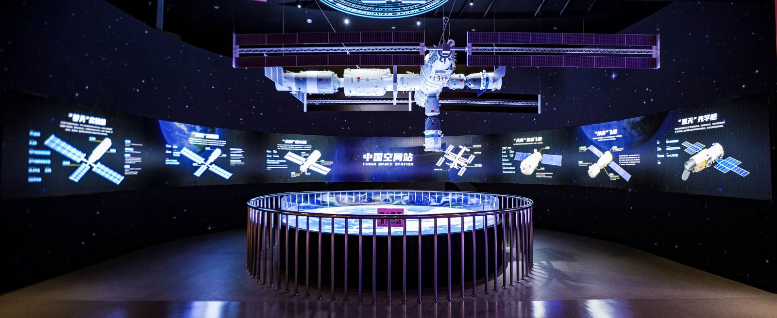 本展項通過空間藝術設計與中國空間站模型展臺相結合,打造創(chuàng)新型科技感的沉浸式展示空間。中國空間站懸掛于半空,與地面展臺的地球畫面遙相呼應,觀眾仿佛看到中國空間站遨游蒼穹的壯觀景象。觀眾可近距離觀看中國空間站模型,感受中國太空之家的魅力,并可通過閱覽燈箱展板,了解關于中國空間站的科普知識。