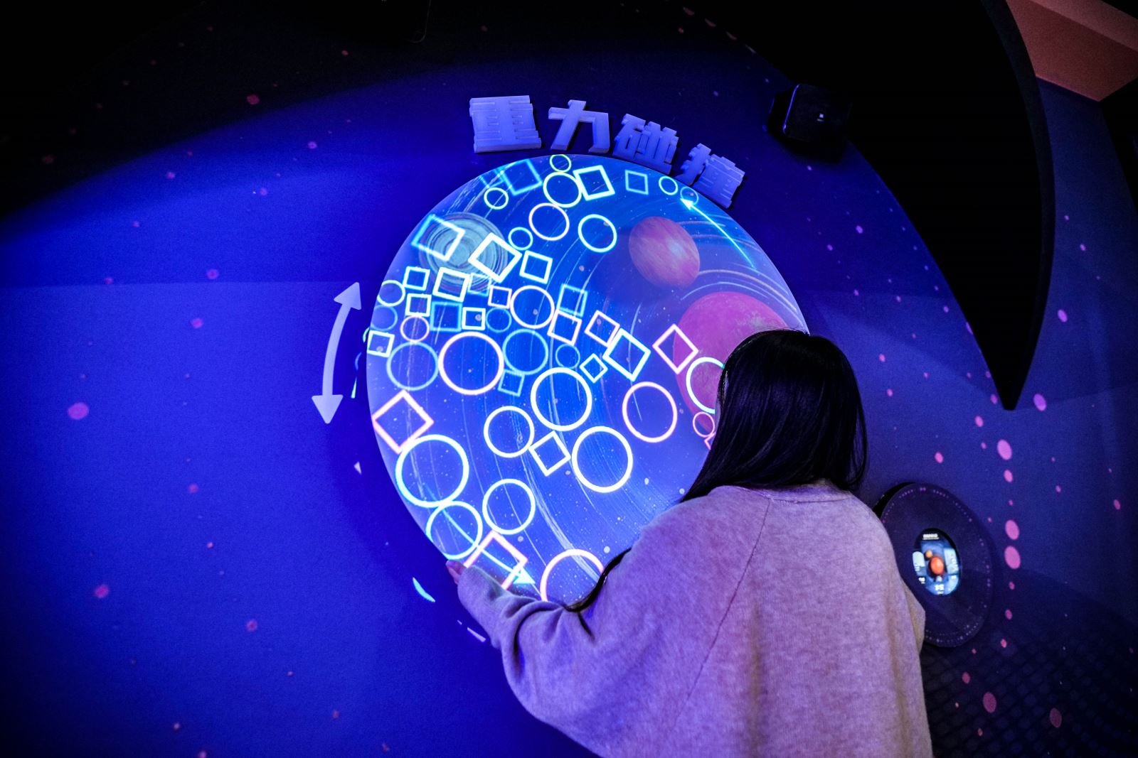 展項位于展館負一層,旨在科普重力的特性內容,利用多媒體技術,模擬物體在地球、月球、太空等不同重力環(huán)境下下落的狀態(tài)。體驗者通過觸摸屏選環(huán)境(地球、月球、 太空),上方投影即現對應場景,旋轉圓形投影面,觀察物體下落變化,直觀感受重力魅力。