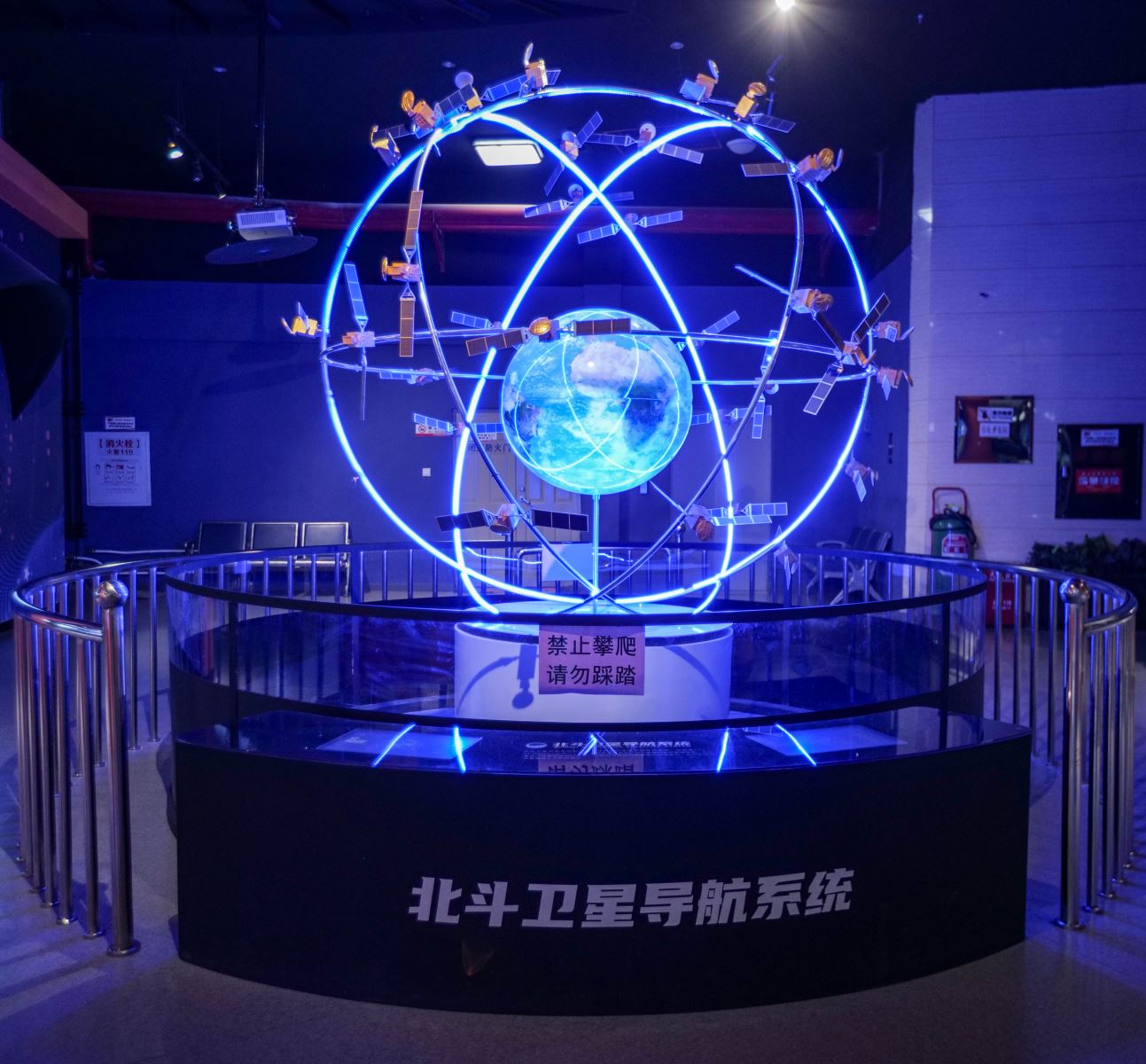 展項通過北斗衛(wèi)星模型與半弧操作臺結合,向觀眾呈現數字化北斗衛(wèi)星導航系統(tǒng)展示空間。北斗衛(wèi)星模型位于展區(qū)中心位置,由若干地球靜止軌道衛(wèi)星、傾斜地球同步軌道衛(wèi)星和中圓地球軌道衛(wèi)星等組成。 半弧操作臺面含兩個觸摸屏幕,觀眾可通過觸摸屏了解關于北斗概述、 北斗的結構組成、北斗的定位原理、北斗的應用四部分內容。 觀眾通過觀看模型和在觸摸屏上觸摸查詢,全面了解北斗衛(wèi)星導航系統(tǒng)及其相關知識。