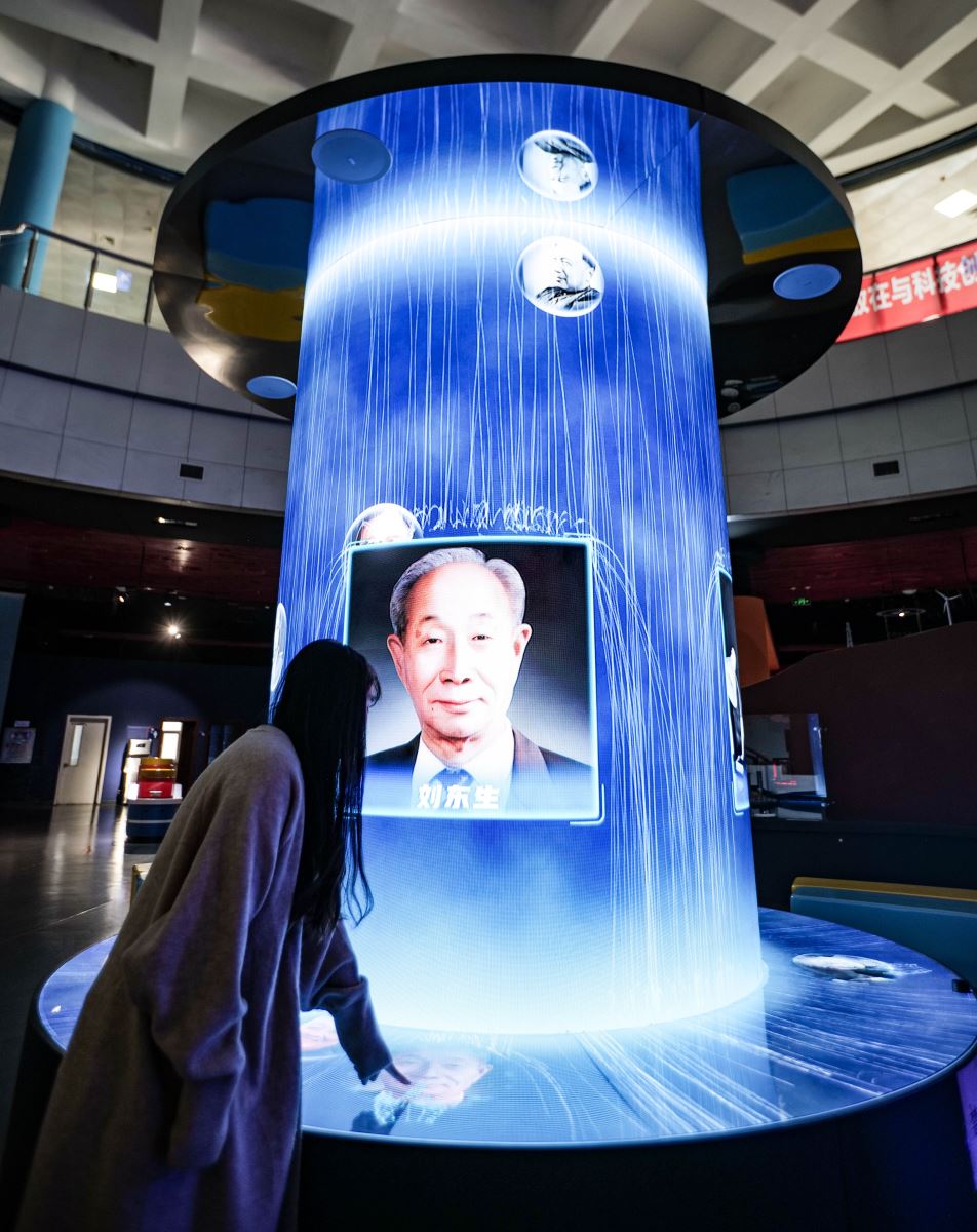 展項采用數字瀑布互動展示系統(tǒng)這一創(chuàng)意表現方式,用光粒子的流體形態(tài)演示出瀑布流水的動態(tài)畫面,配以中國的科學家圖片及科技成果圖片,用全新方式打開觀眾視野,同時通過人機互動識別裝置實現觸摸功能,觀眾可隨時查閱科學家的資料,激勵觀眾弘揚科學報國的光榮傳統(tǒng),追求真理、勇攀高峰的科學精神。
