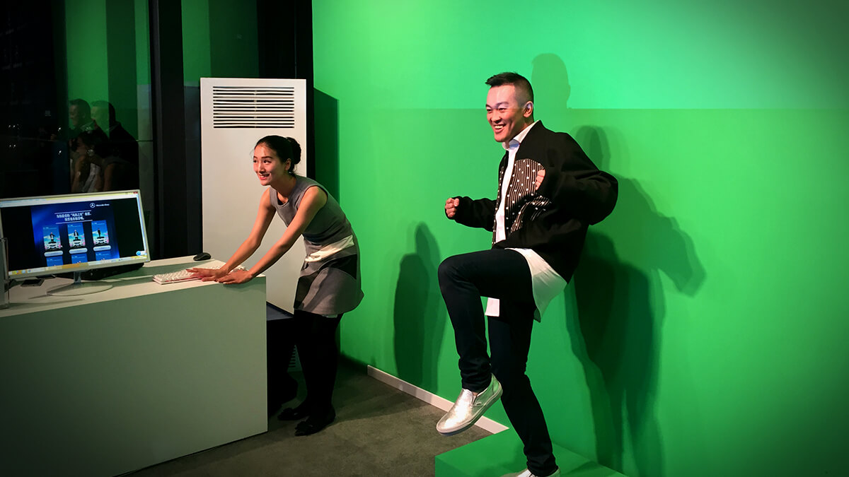 微信拍拍樂(lè)利用綠幕摳像技術(shù)將各汽車(chē)圖像場(chǎng)景與人物結(jié)合在一起完成虛擬拍照,并且照片合成后可通過(guò)掃描二維碼將照片上傳到手機(jī)上,