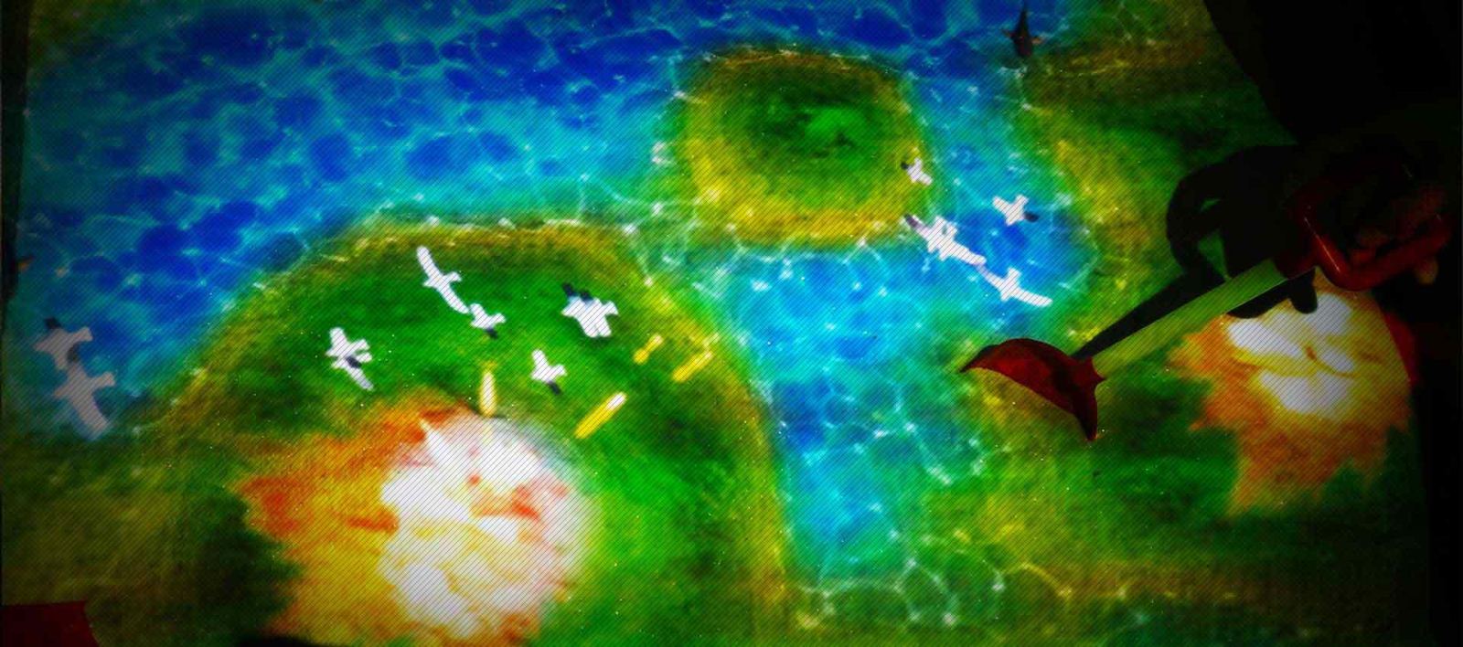 小朋友利用沙堆中的玩具鏟子玩耍沙子,上方的投影會(huì)根據(jù)小朋友固定的不同的沙子形狀顯現(xiàn)出不同的沙堆視覺(jué)效果,堆的高的地方視為山峰,低的地方呈現(xiàn)藍(lán)色水流狀態(tài)效果十分神奇。